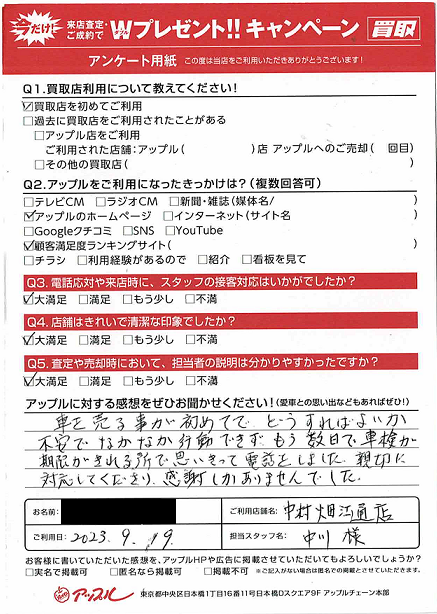 お車のご相談・ 査定だけでもOK! カンタン 入力 30秒 アップルがブランド買取始めました! お電話でも受付中! 受付時間10:00 ~ 19:00 052-483-1181 お車のご相談・ 査定だけでもOK! カンタン 入力 30秒 アップルがブランド買取始めました! お電話でも受付中! 受付時間10:00 ~ 19:00 052-483-1181 アップルがブランド買取始めました! お電話でも受付中! 受付時間10:00 ~ 19:00 052-483-1181 店舗情報 在庫車 スタッフ紹介 ブログ お客様の声 キャンペーン 無料査定 click お客様の声 ご記入日: 2023/09/19 名古屋市 I様 車名:ホンダ フリードスパイク 車を売る事が初めてでどうすればよいか不安でなかなか行動ができず、もう数日で車検が期限がきれる所で思いきって電話をしました。親切に対応してくださり。感謝しかありませんでした。 前へ 次へ お客様の声一覧を見る
