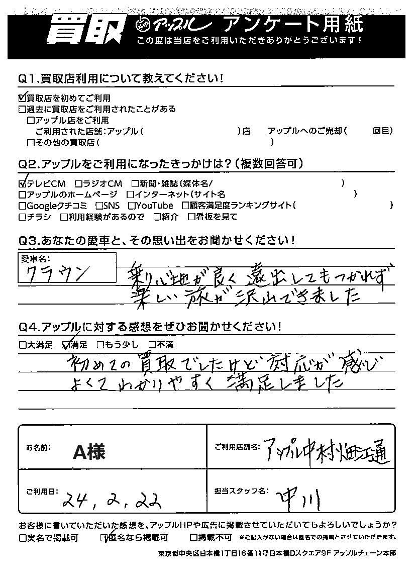 A様 車名:トヨタ クラウン(~H11年8月/H30年6月~)