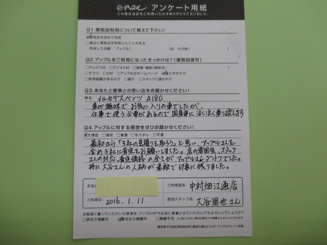 最初から「3社の見積もりを取ろう」と思い、アップルさんを含め3社に査定をお願いしました。店の雰囲気、スタッフさんの応対、査定価格の全てがアップルさんダントツでした。特に大谷さんの人柄が素敵で印象に残りました。