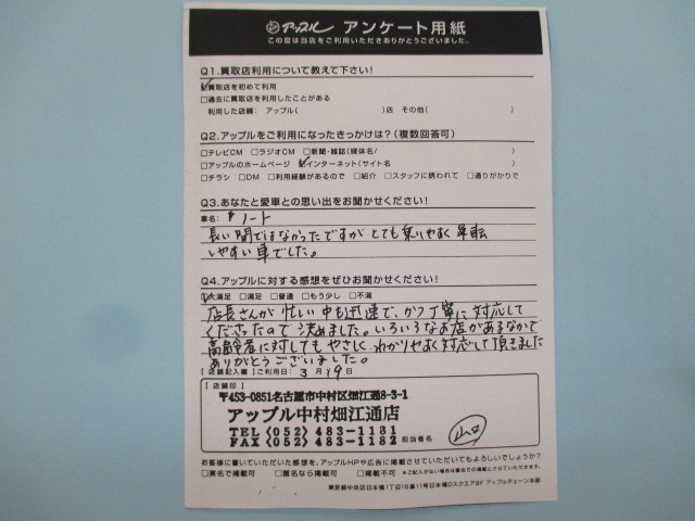 お車のご相談・ 査定だけでもOK! カンタン 入力 30秒 アップルがブランド買取始めました! お電話でも受付中! 受付時間10:00 ~ 19:00 052-483-1181 お車のご相談・ 査定だけでもOK! カンタン 入力 30秒 アップルがブランド買取始めました! お電話でも受付中! 受付時間10:00 ~ 19:00 052-483-1181 アップルがブランド買取始めました! お電話でも受付中! 受付時間10:00 ~ 19:00 052-483-1181 店舗情報 在庫車 スタッフ紹介 ブログ お客様の声 キャンペーン 無料査定 click お客様の声 ご記入日: 2017/03/19 S(女性)様 店長さんが忙しい中も迅速で、かつ丁寧に対応してくださったので決めました。いろいろなお店があるなかで高齢者に対してもやさしく、わかりやすく対応して頂きました。ありがとうございました。 前へ 次へ お客様の声一覧を見る