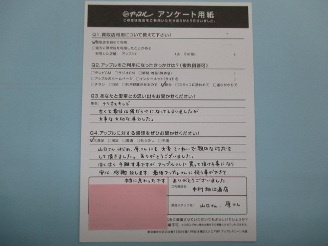 山口さんはじめ、原さんにも大変丁寧で親切な対応をして頂きました。ありがとうございました。泣く泣く手放す車ですが、アップルさんに買って頂ける事になり、安心・感謝致します。最後にアップルさんに伺う事ができて本当に良かったです。ありがとうございました。