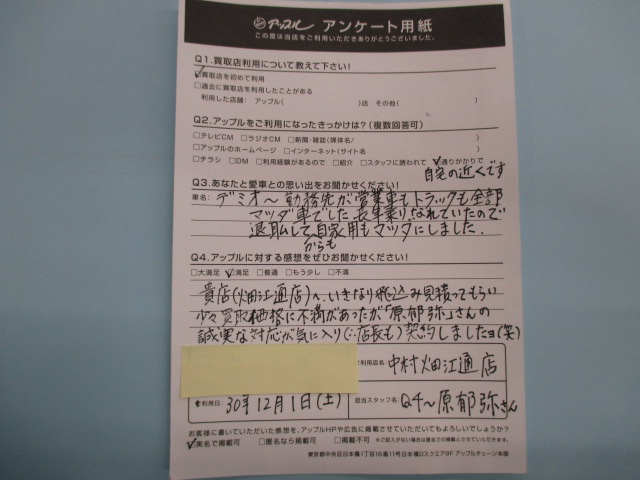 お車のご相談・ 査定だけでもOK! カンタン 入力 30秒 アップルがブランド買取始めました! お電話でも受付中! 受付時間10:00 ~ 19:00 052-483-1181 お車のご相談・ 査定だけでもOK! カンタン 入力 30秒 アップルがブランド買取始めました! お電話でも受付中! 受付時間10:00 ~ 19:00 052-483-1181 アップルがブランド買取始めました! お電話でも受付中! 受付時間10:00 ~ 19:00 052-483-1181 店舗情報 在庫車 スタッフ紹介 ブログ お客様の声 キャンペーン 無料査定 click お客様の声 ご記入日: 2018/12/01 I(男性)様 車名:マツダ デミオ 貴店(畑江通店)へ、いきなり飛び込み見積もってもらい、少々買取価格に不満があったが、「原郁弥」さんの誠実な対応が気に入り(店長も)契約しましたヨ(笑) 前へ 次へ お客様の声一覧を見る