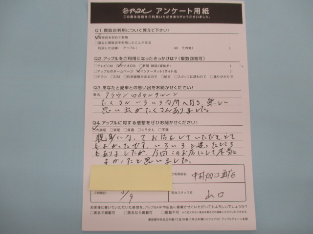 お車のご相談・ 査定だけでもOK! カンタン 入力 30秒 アップルがブランド買取始めました! お電話でも受付中! 受付時間10:00 ~ 19:00 052-483-1181 お車のご相談・ 査定だけでもOK! カンタン 入力 30秒 アップルがブランド買取始めました! お電話でも受付中! 受付時間10:00 ~ 19:00 052-483-1181 アップルがブランド買取始めました! お電話でも受付中! 受付時間10:00 ~ 19:00 052-483-1181 店舗情報 在庫車 スタッフ紹介 ブログ お客様の声 キャンペーン 無料査定 click お客様の声 ご記入日: 2019/03/09 Y(男性)様 車名:トヨタ クラウン(~H11年8月/H30年6月~) 親身になってお話をしていただき、とてもよかったです。いろいろと迷ったところもありましたが、今回このお店にして本当によかったと思いました。 前へ 次へ お客様の声一覧を見る