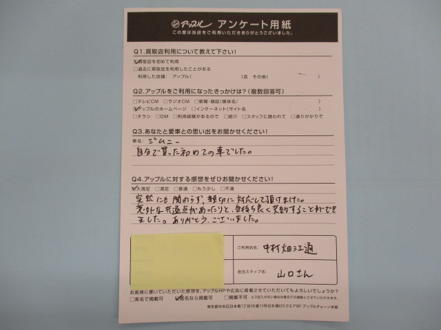 お車のご相談・ 査定だけでもOK! カンタン 入力 30秒 アップルがブランド買取始めました! お電話でも受付中! 受付時間10:00 ~ 19:00 052-483-1181 お車のご相談・ 査定だけでもOK! カンタン 入力 30秒 アップルがブランド買取始めました! お電話でも受付中! 受付時間10:00 ~ 19:00 052-483-1181 アップルがブランド買取始めました! お電話でも受付中! 受付時間10:00 ~ 19:00 052-483-1181 店舗情報 在庫車 スタッフ紹介 ブログ お客様の声 キャンペーン 無料査定 click お客様の声 ご記入日: 2019/05/25 M(男性)様 車名:スズキ ジムニー 突然にも関わらず、親切に対応して頂けました。意外な共通点があったりと、気持ち良く契約することができました。ありがとうございました。 前へ 次へ お客様の声一覧を見る