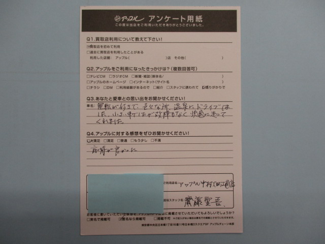 お車のご相談・ 査定だけでもOK! カンタン 入力 30秒 アップルがブランド買取始めました! お電話でも受付中! 受付時間10:00 ~ 19:00 052-483-1181 お車のご相談・ 査定だけでもOK! カンタン 入力 30秒 アップルがブランド買取始めました! お電話でも受付中! 受付時間10:00 ~ 19:00 052-483-1181 アップルがブランド買取始めました! お電話でも受付中! 受付時間10:00 ~ 19:00 052-483-1181 店舗情報 在庫車 スタッフ紹介 ブログ お客様の声 キャンペーン 無料査定 click お客様の声 ご記入日: 2020/10/16 H(男性)様 応対が良かった。 前へ 次へ お客様の声一覧を見る
