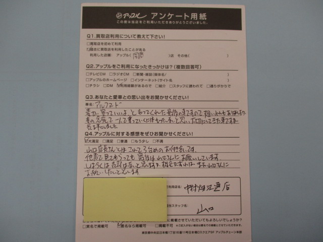 お車のご相談・ 査定だけでもOK! カンタン 入力 30秒 アップルがブランド買取始めました! お電話でも受付中! 受付時間10:00 ~ 19:00 052-483-1181 お車のご相談・ 査定だけでもOK! カンタン 入力 30秒 アップルがブランド買取始めました! お電話でも受付中! 受付時間10:00 ~ 19:00 052-483-1181 アップルがブランド買取始めました! お電話でも受付中! 受付時間10:00 ~ 19:00 052-483-1181 店舗情報 在庫車 スタッフ紹介 ブログ お客様の声 キャンペーン 無料査定 click お客様の声 ご記入日: 2021/01/16 N(男性)様 山口店長とはこれで3台めのお付き合いです。他店で見てもらっても最後は山口さんにお願いしています。しばらく売却はないと思います。機会があればまた山口さんにお願いしたいと思います。 前へ 次へ お客様の声一覧を見る