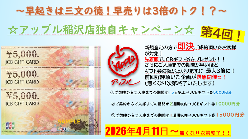 お車のご相談・ 査定だけでもOK! カンタン 入力 30秒 アップルがブランド買取始めました! お電話でも受付中! 受付時間10:00 ~ 19:00 0587-21-0040 お車のご相談・ 査定だけでもOK! カンタン 入力 30秒 アップルがブランド買取始めました! お電話でも受付中! 受付時間10:00 ~ 19:00 0587-21-0040 アップルがブランド買取始めました! お電話でも受付中! 受付時間10:00 ~ 19:00 0587-21-0040 店舗情報 在庫車 スタッフ紹介 ブログ お客様の声 キャンペーン 無料査定 click 最新記事一覧 月別アーカイブ 2026年04月(3)2026年03月(2)2026年02月(1)2026年01月(4)2025年12月(4)2025年11月(6)2025年10月(4)2025年09月(7)2025年08月(8)2025年07月(8)2025年06月(2)2025年05月(5)2025年04月(6)2025年03月(3)2025年02月(1)2025年01月(7)2024年12月(2)2024年11月(4)2024年10月(2)2024年09月(4)2024年08月(4)2024年07月(6)2024年06月(1)2024年05月(4)2024年04月(5)2024年03月(5)2024年02月(2)2024年01月(5)2023年12月(4)2023年11月(4)2023年10月(4)2023年09月(6)2023年08月(6)2023年07月(9)2023年06月(7)2023年05月(4)2023年04月(8)2023年03月(4)2023年02月(3)2023年01月(6)2022年12月(11)2022年11月(8)2022年10月(9)2022年09月(11)2022年08月(9)2022年07月(14)2022年06月(13)2022年05月(6)2022年04月(8)2022年03月(8)2022年02月(9)2022年01月(12)2021年12月(12)2021年11月(11)2021年10月(9)2021年09月(10)2021年08月(14)2021年07月(15)2021年06月(16)2021年05月(11)2021年04月(8)2021年03月(7)2021年02月(8)2021年01月(9)2020年12月(8)2020年11月(7)2020年10月(14)2020年09月(15)2020年08月(17)2020年07月(15)2020年06月(16)2020年05月(13)2020年04月(15)2020年03月(13)2020年02月(17)2020年01月(14)2019年12月(17)2019年11月(13)2019年10月(7)2019年09月(8)2019年08月(10)2019年07月(9)2019年06月(12)2019年05月(16)2019年04月(6)2019年03月(6)2019年02月(12)2019年01月(3)2018年12月(8)2018年11月(8)2018年10月(19)2018年09月(25)2018年08月(22)2018年07月(27)2018年06月(24)2018年05月(16)2018年04月(16)2018年03月(9)2018年02月(5)2018年01月(10)2017年12月(8)2017年11月(5)2017年10月(10)2017年09月(4)2017年08月(7)2017年07月(10)2017年06月(9)2017年05月(10)2017年04月(8)2017年03月(4)2017年02月(7)2017年01月(10)2016年12月(13)2016年11月(8)2016年10月(6)2016年09月(6)2016年08月(5)2016年07月(12)2016年06月(3)2016年05月(5)2016年04月(3)2016年03月(1)2016年02月(1)2016年01月(2)2015年12月(2)2015年11月(3)2015年10月(2)2015年09月(4)2015年08月(4)2015年07月(4)2015年06月(4)2015年05月(4)2015年04月(4)2015年03月(2)2015年02月(4)2015年01月(4)2014年12月(5)2014年11月(9)2014年10月(4)2014年09月(8)2014年08月(12)2014年07月(8)2014年06月(8)2014年05月(7)2014年04月(5)2014年02月(3)2014年01月(3)2013年12月(1)2013年11月(2)2013年09月(1) 1-10/1174件中 [ 未分類 ] 2026/04/12(日) 11:18 ☆入園&入学☆ 皆様こんにちは☆アップル稲沢店の前川です♪本日は気持ちの良い天気ですね!通勤時にバイクツーリングされている方多く絶好のお出かけ日和ですね!さて、本日のブログは『入園&入学』新学期の季節!我が家も長女と次男が入園&入学をしました~!長女は中学生に!次男は保育園に!子供の成長はほんとに早くて驚き… [ 未分類 ] 2026/04/11(土) 10:00 ☆独自キャンペーンと臨時休業のお知らせ☆ 皆様こんにちは☆アップル稲沢店の前川です!!まずは大変お得なキャンペーンのお知らせでございます!!!本日4/11㈯~緊急開催!当店で大変ご好評頂いております、あのキャンペーンを急遽開催できる運びとなりました!その名も、『早起きは三文の徳!早売りは3倍のトク!?』キャンペーンです☆気になる今… [ 未分類 ] 2026/04/04(土) 11:50 ☆岐阜かかみがはら航空宇宙博物館☆ 皆様こんにちは☆アップル稲沢店の前川です♪本日は生憎の雨ですね(>_足元が滑りやすくなっておりますのでお気をつけ下さいませ!さて、先日奥さんが友人と久々にランチに行き春休みで子供たちが家に全員揃っていたのでお出かけしてきました~!!以前ブログで航空ミュージアムをご紹介させて頂きましたが今回は… [ 未分類 ] 2026/03/30(月) 10:24 ご褒美! こんにちわー!最近バイクにハマっております横田です(^^)/もう春ですね!サクラも満開ですね!!!そして、この土・日もたくさんのご来店ありがとうございました!!!おかげさまで、買取車であふれてます(^^♪感謝!!!さて、先日ですが、私たちアップル稲沢店のとある記録を約10年ぶりに塗り替えるこ… [ 未分類 ] 2026/03/24(火) 10:41 ★あいち航空ミュージアム★ 皆様こんにちは☆アップル稲沢店の前川です♪久々のブログ更新となってしまいました最近は日中の気温もあがり桜も咲き始めていますね!我が家も長女が小学校を卒業し4月から中学生です。。。ほんと時が経つのが早いです(>_さて、本日のブログは『あいち航空ミュージアム』☆名古屋空港に隣接するエアポートウォ… [ 未分類 ] 2026/02/08(日) 09:46 ★雪・ユキ・ゆき★ 皆様こんにちは☆アップル稲沢店の前川です♪本日は寒いですね~(>_数日前のポカポカ陽気が恋しい。。。。そんな本日のブログは『雪』!本日稲沢市は雪が舞っております☆画像では分かりづらいですが、結構な勢いで降っております♪朝一番、車の上にはうっすら雪が積もっておりましたが、時間が経つにつれて更に… [ 未分類 ] 2026/01/12(月) 10:00 雪! おはようございます!今日は成人の日ですね!!新成