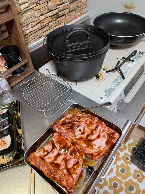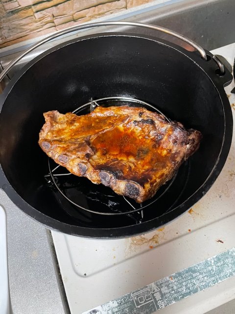 スペアリブBBQソースで味付けして魚焼きグリルとダッジオーブンを使ってローストしました( ^)o(^ )