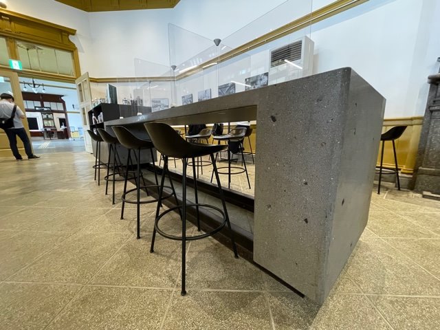 (門司港駅の雰囲気合わせてデザインされています♪ 線路のレールが使われていたり☆)