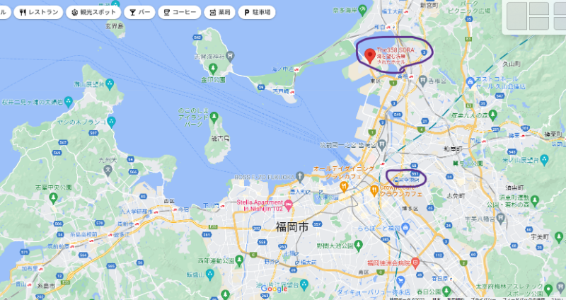 (解像度低くてごめんなさい汗、下の〇が福岡空港で、上の〇がホテルのある場所です)