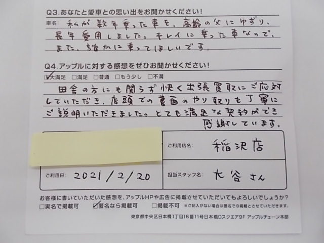 お車のご相談・ 査定だけでもOK! カンタン 入力 30秒 アップルがブランド買取始めました! お電話でも受付中! 受付時間10:00 ~ 19:00 0587-21-0040 お車のご相談・ 査定だけでもOK! カンタン 入力 30秒 アップルがブランド買取始めました! お電話でも受付中! 受付時間10:00 ~ 19:00 0587-21-0040 アップルがブランド買取始めました! お電話でも受付中! 受付時間10:00 ~ 19:00 0587-21-0040 店舗情報 在庫車 スタッフ紹介 ブログ お客様の声 キャンペーン 無料査定 click お客様の声 ご記入日: 2021/02/20 匿名様 車名:ダイハツ ミラココア 田舎の方にも関わらず快く出張買取にご対応して頂き、店頭での書面のやり取りも丁寧にご説明いただきました。とても満足な契約ができ感謝しています。 前へ 次へ お客様の声一覧を見る