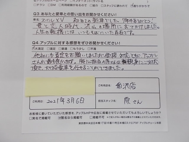 お車のご相談・ 査定だけでもOK! カンタン 入力 30秒 アップルがブランド買取始めました! お電話でも受付中! 受付時間10:00 ~ 19:00 0587-21-0040 お車のご相談・ 査定だけでもOK! カンタン 入力 30秒 アップルがブランド買取始めました! お電話でも受付中! 受付時間10:00 ~ 19:00 0587-21-0040 アップルがブランド買取始めました! お電話でも受付中! 受付時間10:00 ~ 19:00 0587-21-0040 店舗情報 在庫車 スタッフ紹介 ブログ お客様の声 キャンペーン 無料査定 click お客様の声 ご記入日: 2021/03/06 匿名様 車名:スバル インプレッサXV (~2017年5月) 他社にも査定をお願いしましたが、価格、対応ともにアップルさんが最も良かったです。特に担当の原さんは親身にご対応頂き、大切な愛車を任せる事が出来ました。 前へ 次へ お客様の声一覧を見る