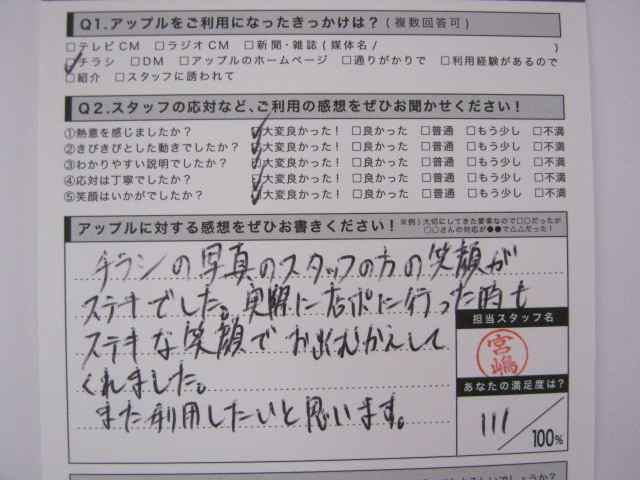 お車のご相談・ 査定だけでもOK! カンタン 入力 30秒 アップルがブランド買取始めました! お電話でも受付中! 受付時間10:00 ~ 19:00 0587-21-0040 お車のご相談・ 査定だけでもOK! カンタン 入力 30秒 アップルがブランド買取始めました! お電話でも受付中! 受付時間10:00 ~ 19:00 0587-21-0040 アップルがブランド買取始めました! お電話でも受付中! 受付時間10:00 ~ 19:00 0587-21-0040 店舗情報 在庫車 スタッフ紹介 ブログ お客様の声 キャンペーン 無料査定 click お客様の声 ご記入日: 2011/10/17 E様 チラシの写真のスタッフの方の笑顔がステキでした。実際に店舗に行った時もステキな笑顔でお出迎えしてくれました。また利用したいと思います。 前へ 次へ お客様の声一覧を見る