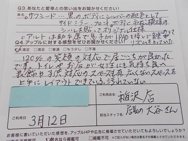 お車のご相談・ 査定だけでもOK! カンタン 入力 30秒 アップルがブランド買取始めました! お電話でも受付中! 受付時間10:00 ~ 19:00 0587-21-0040 お車のご相談・ 査定だけでもOK! カンタン 入力 30秒 アップルがブランド買取始めました! お電話でも受付中! 受付時間10:00 ~ 19:00 0587-21-0040 アップルがブランド買取始めました! お電話でも受付中! 受付時間10:00 ~ 19:00 0587-21-0040 店舗情報 在庫車 スタッフ紹介 ブログ お客様の声 キャンペーン 無料査定 click お客様の声 ご記入日: 2017/03/12 匿名様 120%の笑顔の対応で居ごこちが良かったです。トイレやお店が女性にも気持ち良い装飾や子供対応のスペースも有、広くないスペースを上手にレイアウトできている。汚れていない。 前へ 次へ お客様の声一覧を見る