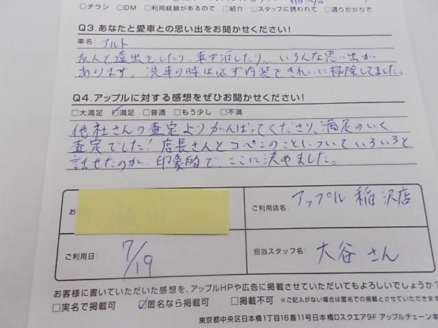 お車のご相談・ 査定だけでもOK! カンタン 入力 30秒 アップルがブランド買取始めました! お電話でも受付中! 受付時間10:00 ~ 19:00 0587-21-0040 お車のご相談・ 査定だけでもOK! カンタン 入力 30秒 アップルがブランド買取始めました! お電話でも受付中! 受付時間10:00 ~ 19:00 0587-21-0040 アップルがブランド買取始めました! お電話でも受付中! 受付時間10:00 ~ 19:00 0587-21-0040 店舗情報 在庫車 スタッフ紹介 ブログ お客様の声 キャンペーン 無料査定 click お客様の声 ご記入日: 2017/07/19 匿名様 他社さんの査定よりがんばってくださり、満足のいく査定でした!店長さんとコペンのことについていろいろと話せたのが印象的で、ここに決めました。 前へ 次へ お客様の声一覧を見る
