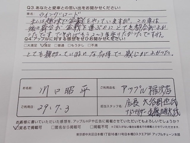 お車のご相談・ 査定だけでもOK! カンタン 入力 30秒 アップルがブランド買取始めました! お電話でも受付中! 受付時間10:00 ~ 19:00 0587-21-0040 お車のご相談・ 査定だけでもOK! カンタン 入力 30秒 アップルがブランド買取始めました! お電話でも受付中! 受付時間10:00 ~ 19:00 0587-21-0040 アップルがブランド買取始めました! お電話でも受付中! 受付時間10:00 ~ 19:00 0587-21-0040 店舗情報 在庫車 スタッフ紹介 ブログ お客様の声 キャンペーン 無料査定 click お客様の声 ご記入日: 2017/07/03 川口昭平様 とても親切、ていねいな応対で感じがよかった。 前へ 次へ お客様の声一覧を見る