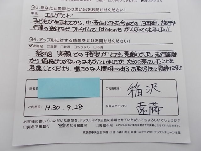 お車のご相談・ 査定だけでもOK! カンタン 入力 30秒 アップルがブランド買取始めました! お電話でも受付中! 受付時間10:00 ~ 19:00 0587-21-0040 お車のご相談・ 査定だけでもOK! カンタン 入力 30秒 アップルがブランド買取始めました! お電話でも受付中! 受付時間10:00 ~ 19:00 0587-21-0040 アップルがブランド買取始めました! お電話でも受付中! 受付時間10:00 ~ 19:00 0587-21-0040 店舗情報 在庫車 スタッフ紹介 ブログ お客様の声 キャンペーン 無料査定 click お客様の声 ご記入日: 2018/09/28 愛知県稲沢市 匿名様 車名:日産 エルグランド 終始笑顔での接客がとても素敵でした。走行距離から値段がつかないのはわかっていましたが、大切に乗っていたことを考慮してくださり、温たかな人間味のあるお取り引きに感謝です!! 前へ 次へ お客様の声一覧を見る