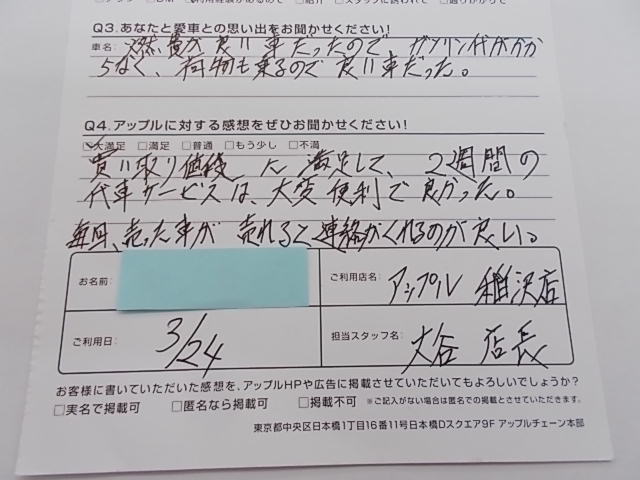 お車のご相談・ 査定だけでもOK! カンタン 入力 30秒 アップルがブランド買取始めました! お電話でも受付中! 受付時間10:00 ~ 19:00 0587-21-0040 お車のご相談・ 査定だけでもOK! カンタン 入力 30秒 アップルがブランド買取始めました! お電話でも受付中! 受付時間10:00 ~ 19:00 0587-21-0040 アップルがブランド買取始めました! お電話でも受付中! 受付時間10:00 ~ 19:00 0587-21-0040 店舗情報 在庫車 スタッフ紹介 ブログ お客様の声 キャンペーン 無料査定 click お客様の声 ご記入日: 2019/03/24 匿名様 車名:トヨタ プリウス(2023年3月~のPHVを含む) 買い取り値段に満足して、2週間の代車サービスは、大変便利で良かった。毎回、売った車が売れると連絡がくれるのが良い。 前へ 次へ お客様の声一覧を見る