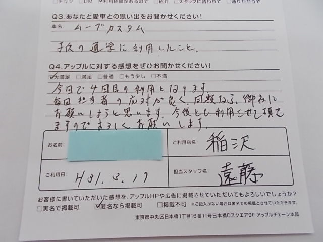お車のご相談・ 査定だけでもOK! カンタン 入力 30秒 アップルがブランド買取始めました! お電話でも受付中! 受付時間10:00 ~ 19:00 0587-21-0040 お車のご相談・ 査定だけでもOK! カンタン 入力 30秒 アップルがブランド買取始めました! お電話でも受付中! 受付時間10:00 ~ 19:00 0587-21-0040 アップルがブランド買取始めました! お電話でも受付中! 受付時間10:00 ~ 19:00 0587-21-0040 店舗情報 在庫車 スタッフ紹介 ブログ お客様の声 キャンペーン 無料査定 click お客様の声 ご記入日: 2019/03/17 匿名様 車名:ダイハツ ムーヴ 今回で4回目の利用となります。毎回担当者の対応が良く、同額なら御社にお願いしようと思います。今後とも利用させて頂きますのでよろしくお願いします。 前へ 次へ お客様の声一覧を見る