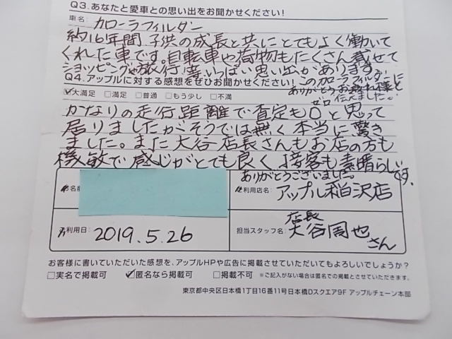 匿名様 車名:トヨタ カローラフィールダー フィールダー(カローラ)