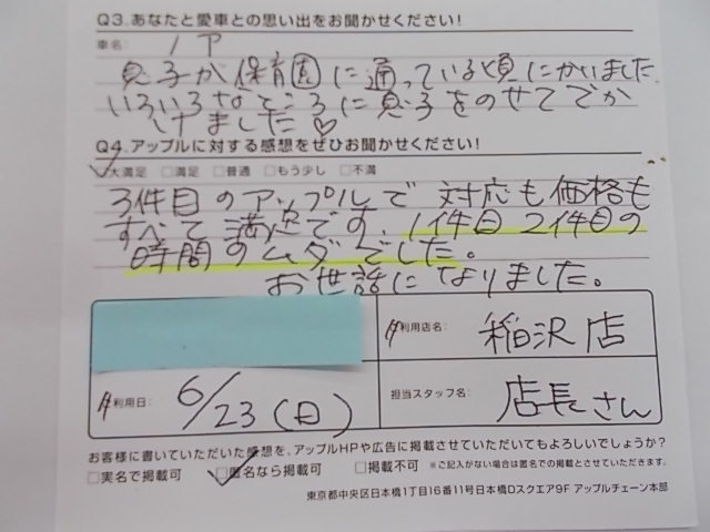 お車のご相談・ 査定だけでもOK! カンタン 入力 30秒 アップルがブランド買取始めました! お電話でも受付中! 受付時間10:00 ~ 19:00 0587-21-0040 お車のご相談・ 査定だけでもOK! カンタン 入力 30秒 アップルがブランド買取始めました! お電話でも受付中! 受付時間10:00 ~ 19:00 0587-21-0040 アップルがブランド買取始めました! お電話でも受付中! 受付時間10:00 ~ 19:00 0587-21-0040 店舗情報 在庫車 スタッフ紹介 ブログ お客様の声 キャンペーン 無料査定 click お客様の声 ご記入日: 2019/06/23 匿名様 車名:トヨタ ノア 3件目のアップルで対応も価格もすべて満足です。1件目2件目の時間のムダでした。お世話になりました。 前へ 次へ お客様の声一覧を見る
