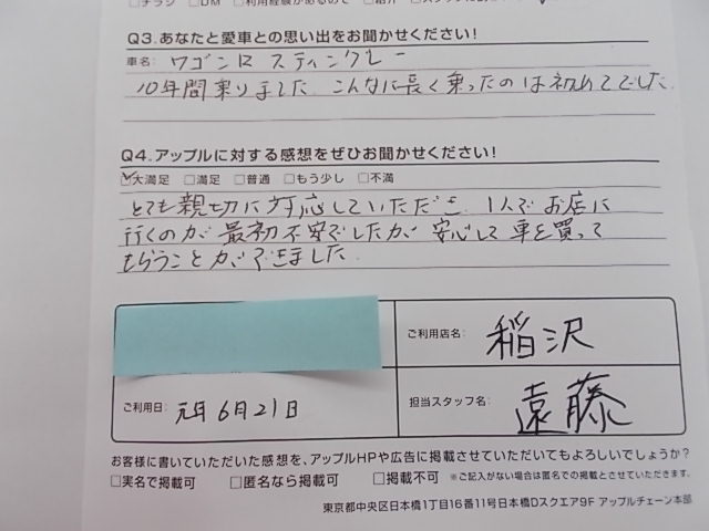 お車のご相談・ 査定だけでもOK! カンタン 入力 30秒 アップルがブランド買取始めました! お電話でも受付中! 受付時間10:00 ~ 19:00 0587-21-0040 お車のご相談・ 査定だけでもOK! カンタン 入力 30秒 アップルがブランド買取始めました! お電話でも受付中! 受付時間10:00 ~ 19:00 0587-21-0040 アップルがブランド買取始めました! お電話でも受付中! 受付時間10:00 ~ 19:00 0587-21-0040 店舗情報 在庫車 スタッフ紹介 ブログ お客様の声 キャンペーン 無料査定 click お客様の声 ご記入日: 2019/06/21 匿名様 車名:スズキ ワゴンR とても親切に対応していただき、1人でお店に行くのが最初不安でしたが安心して車を買ってもらうことができました。 前へ 次へ お客様の声一覧を見る