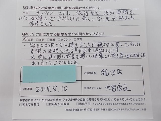 お車のご相談・ 査定だけでもOK! カンタン 入力 30秒 アップルがブランド買取始めました! お電話でも受付中! 受付時間10:00 ~ 19:00 0587-21-0040 お車のご相談・ 査定だけでもOK! カンタン 入力 30秒 アップルがブランド買取始めました! お電話でも受付中! 受付時間10:00 ~ 19:00 0587-21-0040 アップルがブランド買取始めました! お電話でも受付中! 受付時間10:00 ~ 19:00 0587-21-0040 店舗情報 在庫車 スタッフ紹介 ブログ お客様の声 キャンペーン 無料査定 click お客様の声 ご記入日: 2019/08/10 匿名様 車名:トヨタ ハイエースワゴン 初めて利用させて頂きましたが親切に接してもらい希望の金額で売ることが出来、満足しています。また、車を渡す時に写真を撮って現像して頂き良い思い出となりました。ありがとうございました。 前へ 次へ お客様の声一覧を見る