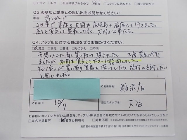 お車のご相談・ 査定だけでもOK! カンタン 入力 30秒 アップルがブランド買取始めました! お電話でも受付中! 受付時間10:00 ~ 19:00 0587-21-0040 お車のご相談・ 査定だけでもOK! カンタン 入力 30秒 アップルがブランド買取始めました! お電話でも受付中! 受付時間10:00 ~ 19:00 0587-21-0040 アップルがブランド買取始めました! お電話でも受付中! 受付時間10:00 ~ 19:00 0587-21-0040 店舗情報 在庫車 スタッフ紹介 ブログ お客様の声 キャンペーン 無料査定 click お客様の声 ご記入日: 2019/10/07 匿名様 車名:トヨタ ヴァンガード 予想以上に高く買い取って頂きました。2度査定に行きましたが、名前も覚えてて下さってて感激しました。知り合いが買い取り業者を探していたら絶対に紹介したいと思いました。 前へ 次へ お客様の声一覧を見る