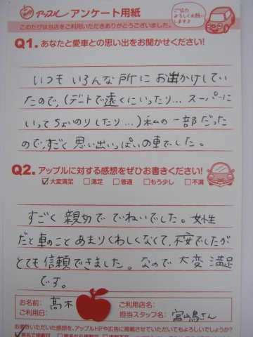いつもいろんなところにお出かけしていたので(デートで遠くに行ったり…スーパーに行ってちょいのりしたり…)私の一部だったので、すごく思い出いっぱいの車でした。