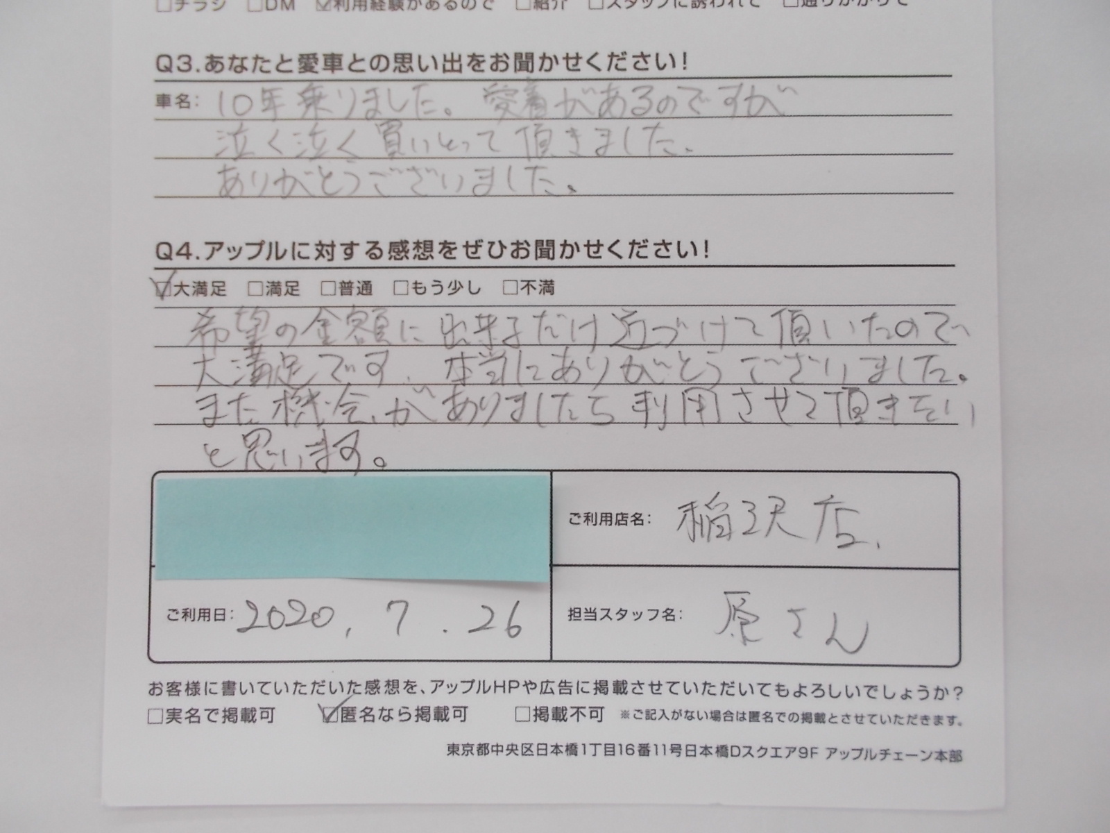 お車のご相談・ 査定だけでもOK! カンタン 入力 30秒 アップルがブランド買取始めました! お電話でも受付中! 受付時間10:00 ~ 19:00 0587-21-0040 お車のご相談・ 査定だけでもOK! カンタン 入力 30秒 アップルがブランド買取始めました! お電話でも受付中! 受付時間10:00 ~ 19:00 0587-21-0040 アップルがブランド買取始めました! お電話でも受付中! 受付時間10:00 ~ 19:00 0587-21-0040 店舗情報 在庫車 スタッフ紹介 ブログ お客様の声 キャンペーン 無料査定 click お客様の声 ご記入日: 2020/07/26 匿名様 車名:スズキ エブリイ 希望の金額にできるだけ近づけて頂いたので大満足です。本当にありがとうございました。また機会がありましたら利用させていただきたいと思います。 前へ 次へ お客様の声一覧を見る