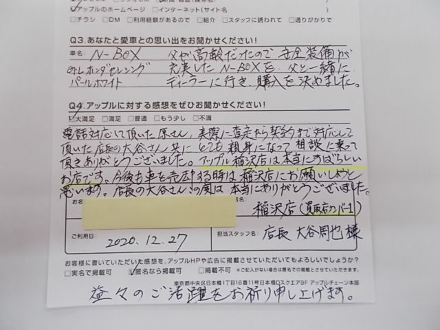 電話対応して頂いた原さん、実際に査定から契約まで対応して頂いた店長の大谷さん共にとても親身になって相談に乗って頂きありがとうございました。アップル稲沢店は本当にすばらしいお店です。今後も車を売却する時は稲沢店にお願いしようと思います。店長の大谷さんこの度は本当にありがとうございました。益々のご活躍をお祈り申し上げます。