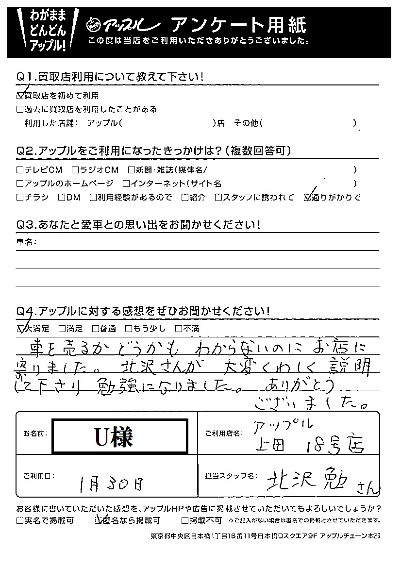 お車のご相談・ 査定だけでもOK! カンタン 入力 30秒 アップルがブランド買取始めました! お電話でも受付中! 受付時間10:00 ~ 19:00 0268-26-2355 お車のご相談・ 査定だけでもOK! カンタン 入力 30秒 アップルがブランド買取始めました! お電話でも受付中! 受付時間10:00 ~ 19:00 0268-26-2355 アップルがブランド買取始めました! お電話でも受付中! 受付時間10:00 ~ 19:00 0268-26-2355 店舗情報 在庫車 スタッフ紹介 ブログ お客様の声 キャンペーン お得 無料査定 click お客様の声 ご記入日: 2021/01/30 U様 Q アップルに対する感想をぜひお聞かせください!感想:大満足車を売るかどうかもわからないのにお店に寄りました。北沢さんが大変くわしく説明してくださり勉強になりました。ありがとうございました。 前へ 次へ お客様の声一覧を見る