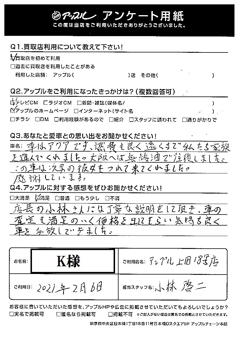 K様 車名:トヨタ アクア