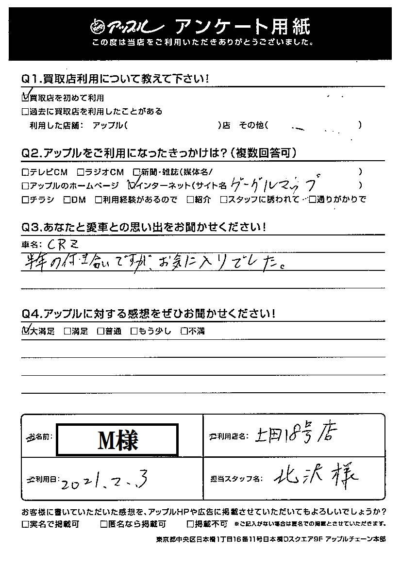 お車のご相談・ 査定だけでもOK! カンタン 入力 30秒 アップルがブランド買取始めました! お電話でも受付中! 受付時間10:00 ~ 19:00 0268-26-2355 お車のご相談・ 査定だけでもOK! カンタン 入力 30秒 アップルがブランド買取始めました! お電話でも受付中! 受付時間10:00 ~ 19:00 0268-26-2355 アップルがブランド買取始めました! お電話でも受付中! 受付時間10:00 ~ 19:00 0268-26-2355 店舗情報 在庫車 スタッフ紹介 ブログ お客様の声 キャンペーン お得 無料査定 click お客様の声 ご記入日: 2021/02/03 M様 車名:ホンダ CR-Z Q あなたと愛車との思い出をお聞かせください!半年の付き合いですが、お気に入りでした。Q アップルに対する感想をぜひお聞かせください!感想:大満足 前へ 次へ お客様の声一覧を見る