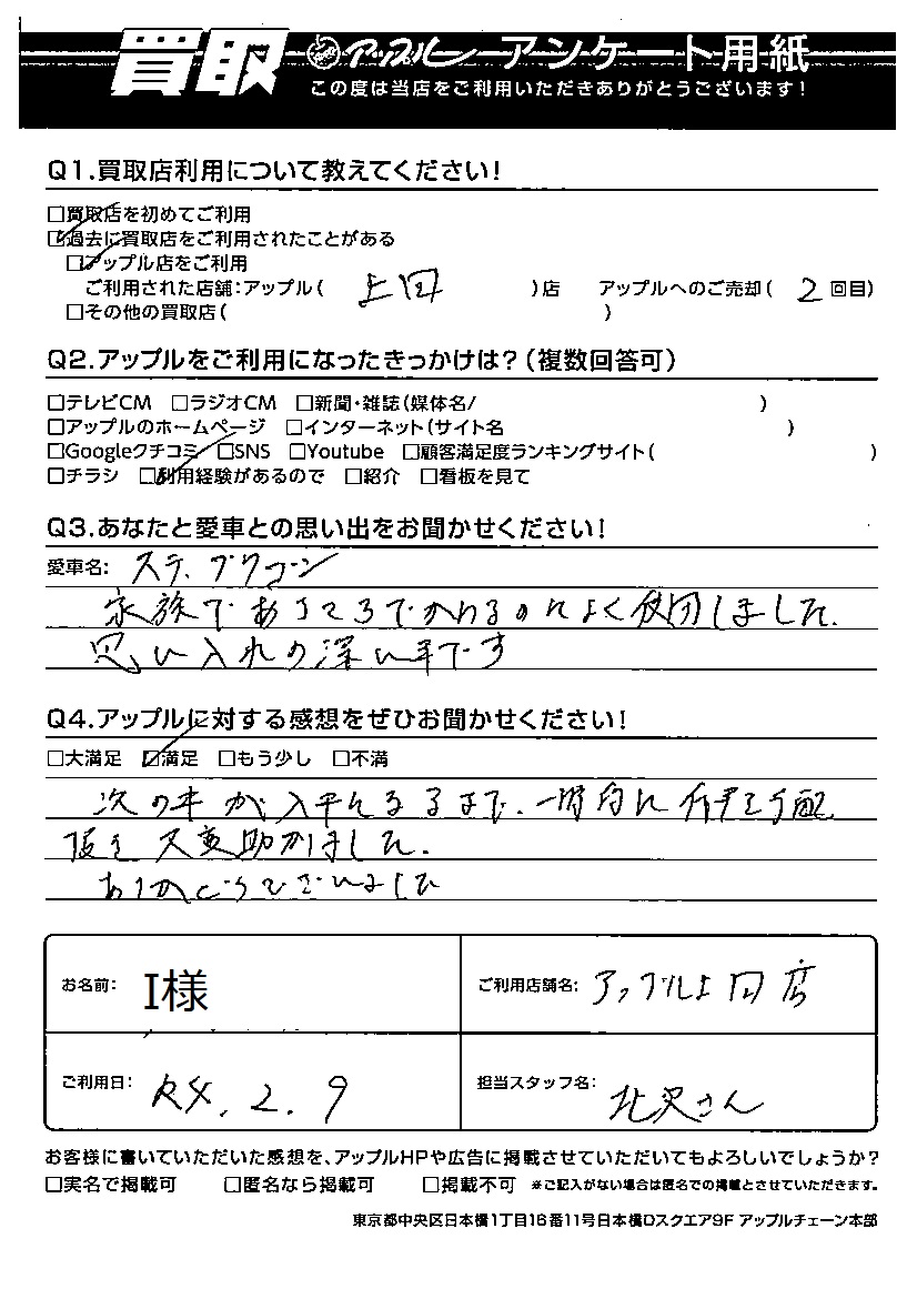 お車のご相談・ 査定だけでもOK! カンタン 入力 30秒 アップルがブランド買取始めました! お電話でも受付中! 受付時間10:00 ~ 19:00 0268-26-2355 お車のご相談・ 査定だけでもOK! カンタン 入力 30秒 アップルがブランド買取始めました! お電話でも受付中! 受付時間10:00 ~ 19:00 0268-26-2355 アップルがブランド買取始めました! お電話でも受付中! 受付時間10:00 ~ 19:00 0268-26-2355 店舗情報 在庫車 スタッフ紹介 ブログ お客様の声 キャンペーン お得 無料査定 click お客様の声 ご記入日: 2022/02/09 I様 車名:ホンダ ステップワゴン Q アップルに対する感想をぜひお聞かせください!感想:満足次の車が入手するまで、一時的に代車を手配頂き大変助かりました。ありがとうございました。 前へ 次へ お客様の声一覧を見る