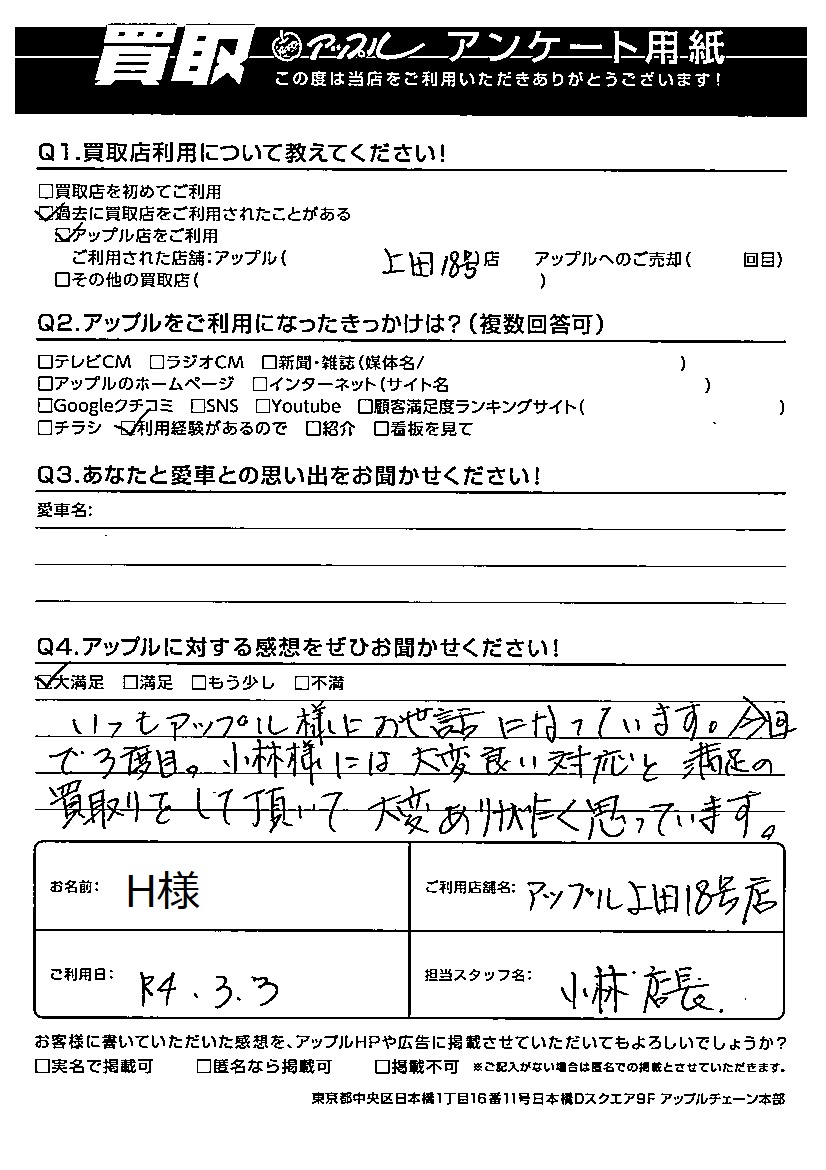 お車のご相談・ 査定だけでもOK! カンタン 入力 30秒 アップルがブランド買取始めました! お電話でも受付中! 受付時間10:00 ~ 19:00 0268-26-2355 お車のご相談・ 査定だけでもOK! カンタン 入力 30秒 アップルがブランド買取始めました! お電話でも受付中! 受付時間10:00 ~ 19:00 0268-26-2355 アップルがブランド買取始めました! お電話でも受付中! 受付時間10:00 ~ 19:00 0268-26-2355 店舗情報 在庫車 スタッフ紹介 ブログ お客様の声 キャンペーン お得 無料査定 click お客様の声 ご記入日: 2022/03/03 H様 Q アップルに対する感想をぜひお聞かせください!感想:大満足いつもアップル様にお世話になっています。今回で3度目。小林様には大変良い対応と満足の買取りをして頂き大変ありがたく思っています。 前へ 次へ お客様の声一覧を見る