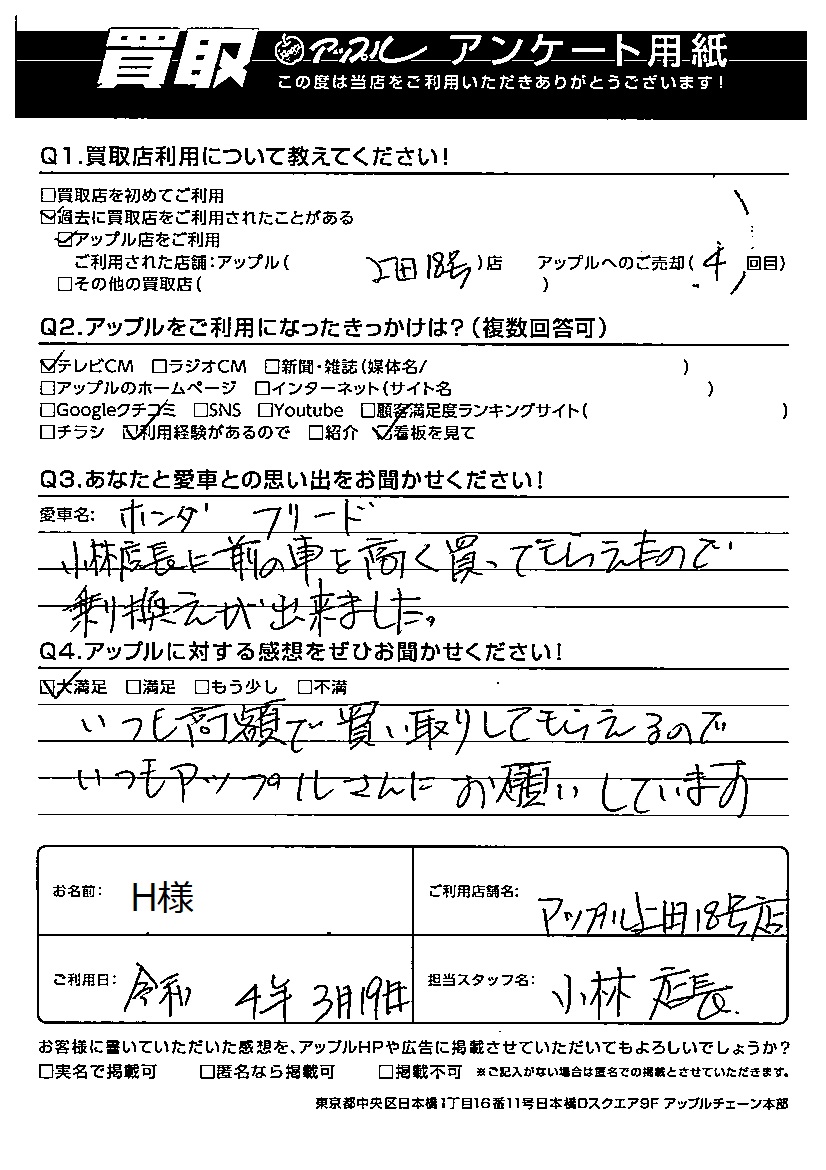 H様 車名:ホンダ フリード(H28年9月以降のハイブリッド含む)