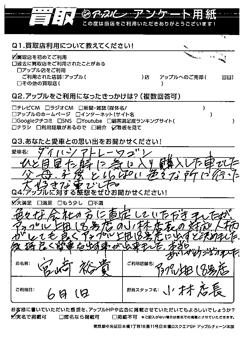 宮崎 裕貴様 車名:ダイハツ アトレーワゴン
