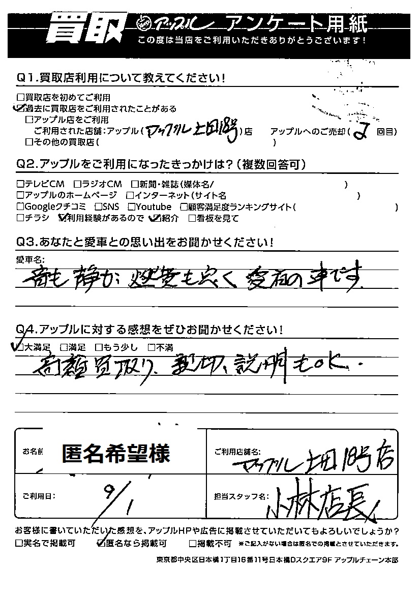 お車のご相談・ 査定だけでもOK! カンタン 入力 30秒 アップルがブランド買取始めました! お電話でも受付中! 受付時間10:00 ~ 19:00 0268-26-2355 お車のご相談・ 査定だけでもOK! カンタン 入力 30秒 アップルがブランド買取始めました! お電話でも受付中! 受付時間10:00 ~ 19:00 0268-26-2355 アップルがブランド買取始めました! お電話でも受付中! 受付時間10:00 ~ 19:00 0268-26-2355 店舗情報 在庫車 スタッフ紹介 ブログ お客様の声 キャンペーン お得 無料査定 click お客様の声 ご記入日: 2022/09/01 匿名希望様 Q あなたと愛車との思い出をお聞かせください!音も静か、燃費もよく愛着の車です。Q アップルに対する感想をぜひお聞かせください!感想:大満足高額買取り、親切、説明もOK 前へ 次へ お客様の声一覧を見る