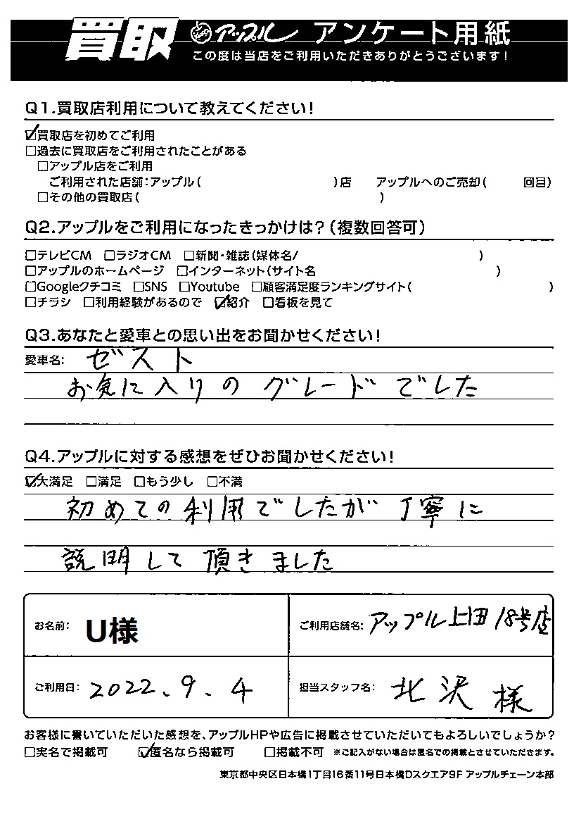 お車のご相談・ 査定だけでもOK! カンタン 入力 30秒 アップルがブランド買取始めました! お電話でも受付中! 受付時間10:00 ~ 19:00 0268-26-2355 お車のご相談・ 査定だけでもOK! カンタン 入力 30秒 アップルがブランド買取始めました! お電話でも受付中! 受付時間10:00 ~ 19:00 0268-26-2355 アップルがブランド買取始めました! お電話でも受付中! 受付時間10:00 ~ 19:00 0268-26-2355 店舗情報 在庫車 スタッフ紹介 ブログ お客様の声 キャンペーン お得 無料査定 click お客様の声 ご記入日: 2022/09/04 U様 車名:ホンダ ゼスト Q あなたと愛車との思い出をお聞かせください!お気に入りのグレードでした。Q アップルに対する感想をぜひお聞かせください!感想:大満足初めての利用でしたが丁寧に説明して頂きました。 前へ 次へ お客様の声一覧を見る