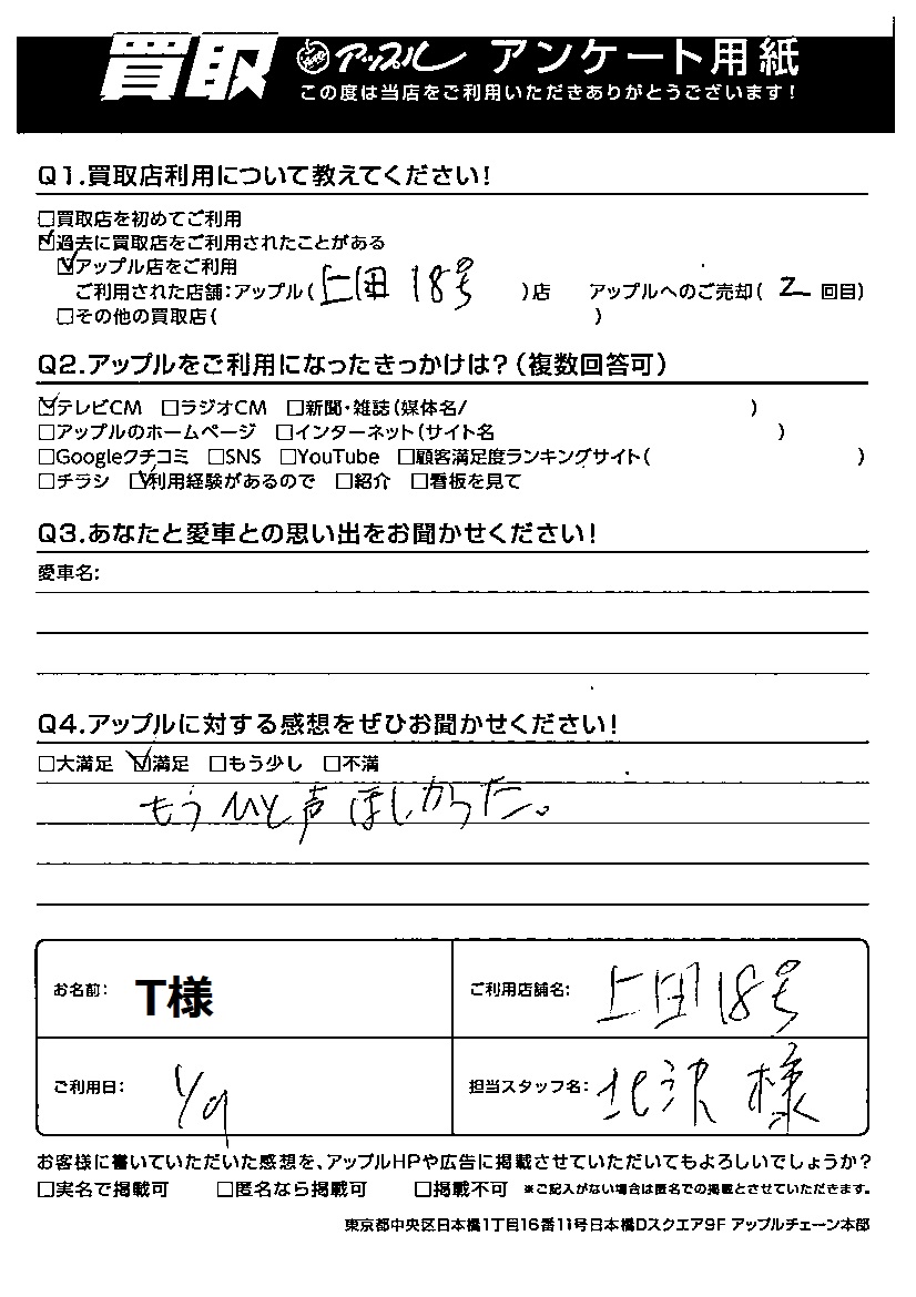 お車のご相談・ 査定だけでもOK! カンタン 入力 30秒 アップルがブランド買取始めました! お電話でも受付中! 受付時間10:00 ~ 19:00 0268-26-2355 お車のご相談・ 査定だけでもOK! カンタン 入力 30秒 アップルがブランド買取始めました! お電話でも受付中! 受付時間10:00 ~ 19:00 0268-26-2355 アップルがブランド買取始めました! お電話でも受付中! 受付時間10:00 ~ 19:00 0268-26-2355 店舗情報 在庫車 スタッフ紹介 ブログ お客様の声 キャンペーン お得 無料査定 click お客様の声 ご記入日: 2023/03/06 T様 ご利用日:2023年1月9日満足!もう一声ほしかった担当 北沢 前へ 次へ お客様の声一覧を見る