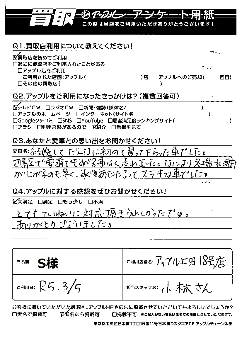 A:結婚してだんなに初めて買ってもらった車でした。