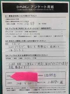 お車のご相談・ 査定だけでもOK! カンタン 入力 30秒 アップルがブランド買取始めました! お電話でも受付中! 受付時間10:00 ~ 19:00 0268-26-2355 お車のご相談・ 査定だけでもOK! カンタン 入力 30秒 アップルがブランド買取始めました! お電話でも受付中! 受付時間10:00 ~ 19:00 0268-26-2355 アップルがブランド買取始めました! お電話でも受付中! 受付時間10:00 ~ 19:00 0268-26-2355 店舗情報 在庫車 スタッフ紹介 ブログ お客様の声 キャンペーン お得 無料査定 click お客様の声 ご記入日: 2018/09/20 上田市N様 アンケートまでご記入・投函してくださり誠にありがとございます。手元に届きこの様な御礼を頂くと又頑張りの力が出ます。これからも沢山の笑顔が見れる様日々精進して参りたいと思います。小林 前へ 次へ お客様の声一覧を見る