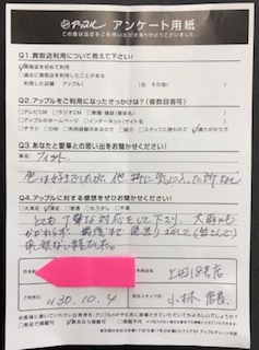 お車のご相談・ 査定だけでもOK! カンタン 入力 30秒 アップルがブランド買取始めました! お電話でも受付中! 受付時間10:00 ~ 19:00 0268-26-2355 お車のご相談・ 査定だけでもOK! カンタン 入力 30秒 アップルがブランド買取始めました! お電話でも受付中! 受付時間10:00 ~ 19:00 0268-26-2355 アップルがブランド買取始めました! お電話でも受付中! 受付時間10:00 ~ 19:00 0268-26-2355 店舗情報 在庫車 スタッフ紹介 ブログ お客様の声 キャンペーン お得 無料査定 click お客様の声 ご記入日: 2018/10/04 上田市H様 この度は当店をご利用頂きまして誠に感謝申し上げます。貴重なご意見も頂戴致しましてありがたく思います。今後も日々精進してまいる所存でございます。H様の益々のご活躍を心よりお祈り申し上げます。小林 前へ 次へ お客様の声一覧を見る