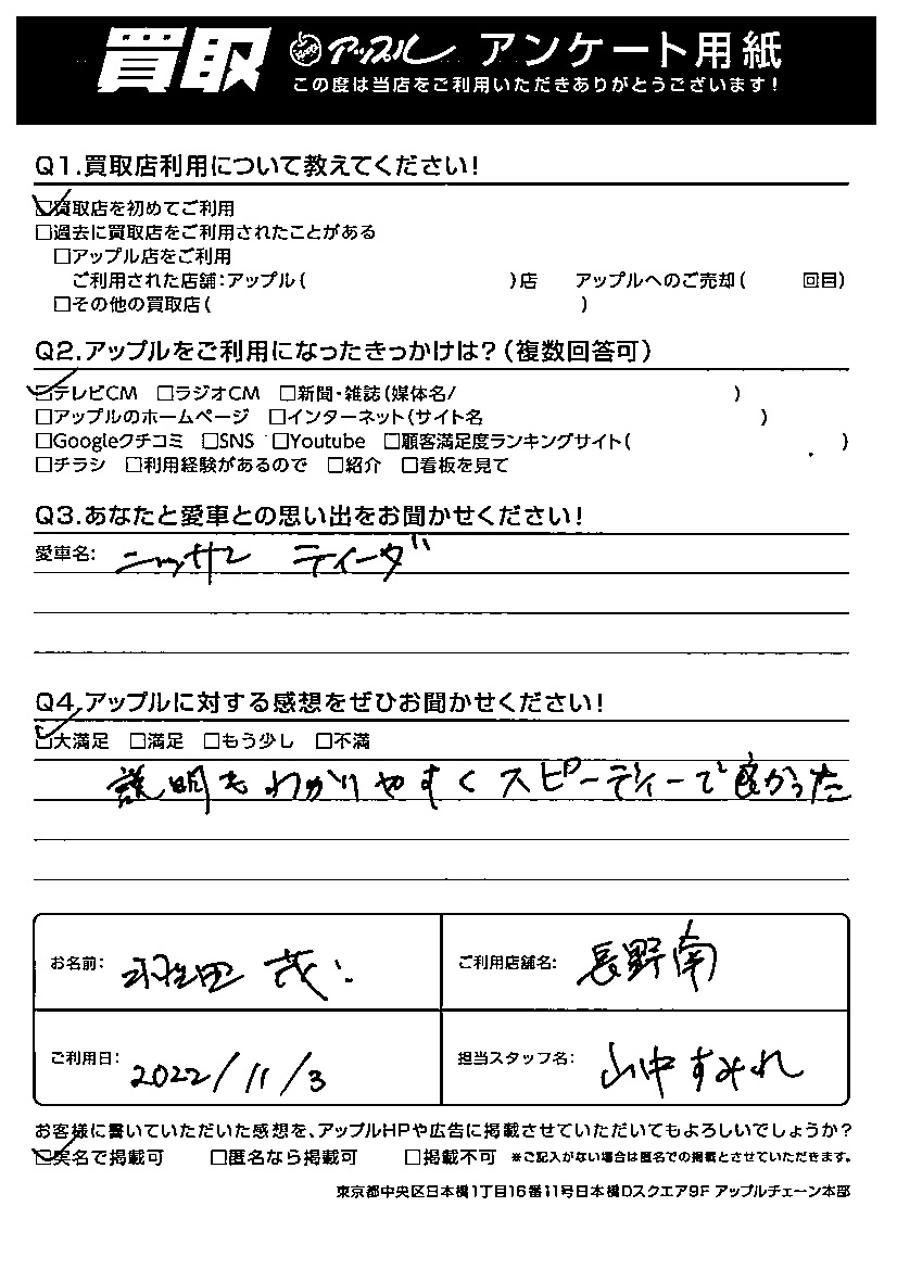お車のご相談・ 査定だけでもOK! カンタン 入力 30秒 アップルがブランド買取始めました! お電話でも受付中! 受付時間10:00 ~ 19:00 026-293-6300 お車のご相談・ 査定だけでもOK! カンタン 入力 30秒 アップルがブランド買取始めました! お電話でも受付中! 受付時間10:00 ~ 19:00 026-293-6300 アップルがブランド買取始めました! お電話でも受付中! 受付時間10:00 ~ 19:00 026-293-6300 店舗情報 在庫車 スタッフ紹介 ブログ お客様の声 キャンペーン 無料査定 click お客様の声 ご記入日: 2023/02/02 羽生田 茂様 車名:日産 ティーダ ご利用日:2022年11月3日説明も分かりやすく、スピーディーで良かった。 前へ 次へ お客様の声一覧を見る