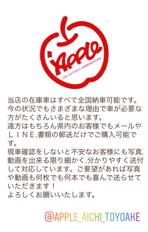 お車のご相談・ 査定だけでもOK! カンタン 入力 30秒 アップルがブランド買取始めました! お電話でも受付中! 受付時間10:00~19:30 0562-91-0500 お車のご相談・ 査定だけでもOK! カンタン 入力 30秒 アップルがブランド買取始めました! お電話でも受付中! 受付時間10:00~19:30 0562-91-0500 アップルがブランド買取始めました! お電話でも受付中! 受付時間10:00~19:30 0562-91-0500 店舗情報 在庫車 スタッフ紹介 ブログ お客様の声 キャンペーン お得 無料査定 click [ 未分類 ] 2020/04/15 (水) 11:39 当店からお客様へ 2020-04-15 11:39:15 新しい記事へ 古い記事へ 最新記事 ★クリスマスツリー★DAMDジムニー コンプリート取り扱い★Wプレゼントキャンペーン★夏季休暇のお知らせ★2023新春初売り★ 店舗情報に戻る 月別アーカイブ 2024年11月(1)2023年11月(1)2023年08月(2)2022年12月(1)2022年11月(1)2022年01月(1)2021年12月(2)2021年09月(1)2021年07月(1)2021年02月(1)2021年01月(2)2020年04月(4)2019年10月(1)2019年08月(1)2019年07月(1)