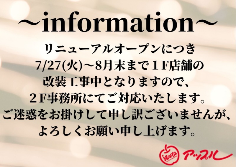 お車のご相談・ 査定だけでもOK! カンタン 入力 30秒 アップルがブランド買取始めました! お電話でも受付中! 受付時間10:00~19:30 0562-91-0500 お車のご相談・ 査定だけでもOK! カンタン 入力 30秒 アップルがブランド買取始めました! お電話でも受付中! 受付時間10:00~19:30 0562-91-0500 アップルがブランド買取始めました! お電話でも受付中! 受付時間10:00~19:30 0562-91-0500 店舗情報 在庫車 スタッフ紹介 ブログ お客様の声 キャンペーン お得 無料査定 click [ 未分類 ] 2021/07/26 (月) 19:54 店舗改装工事のお知らせ 2021-07-26 19:54:15 新しい記事へ 古い記事へ 最新記事 ★クリスマスツリー★DAMDジムニー コンプリート取り扱い★Wプレゼントキャンペーン★夏季休暇のお知らせ★2023新春初売り★ 店舗情報に戻る 月別アーカイブ 2024年11月(1)2023年11月(1)2023年08月(2)2022年12月(1)2022年11月(1)2022年01月(1)2021年12月(2)2021年09月(1)2021年07月(1)2021年02月(1)2021年01月(2)2020年04月(4)2019年10月(1)2019年08月(1)2019年07月(1)