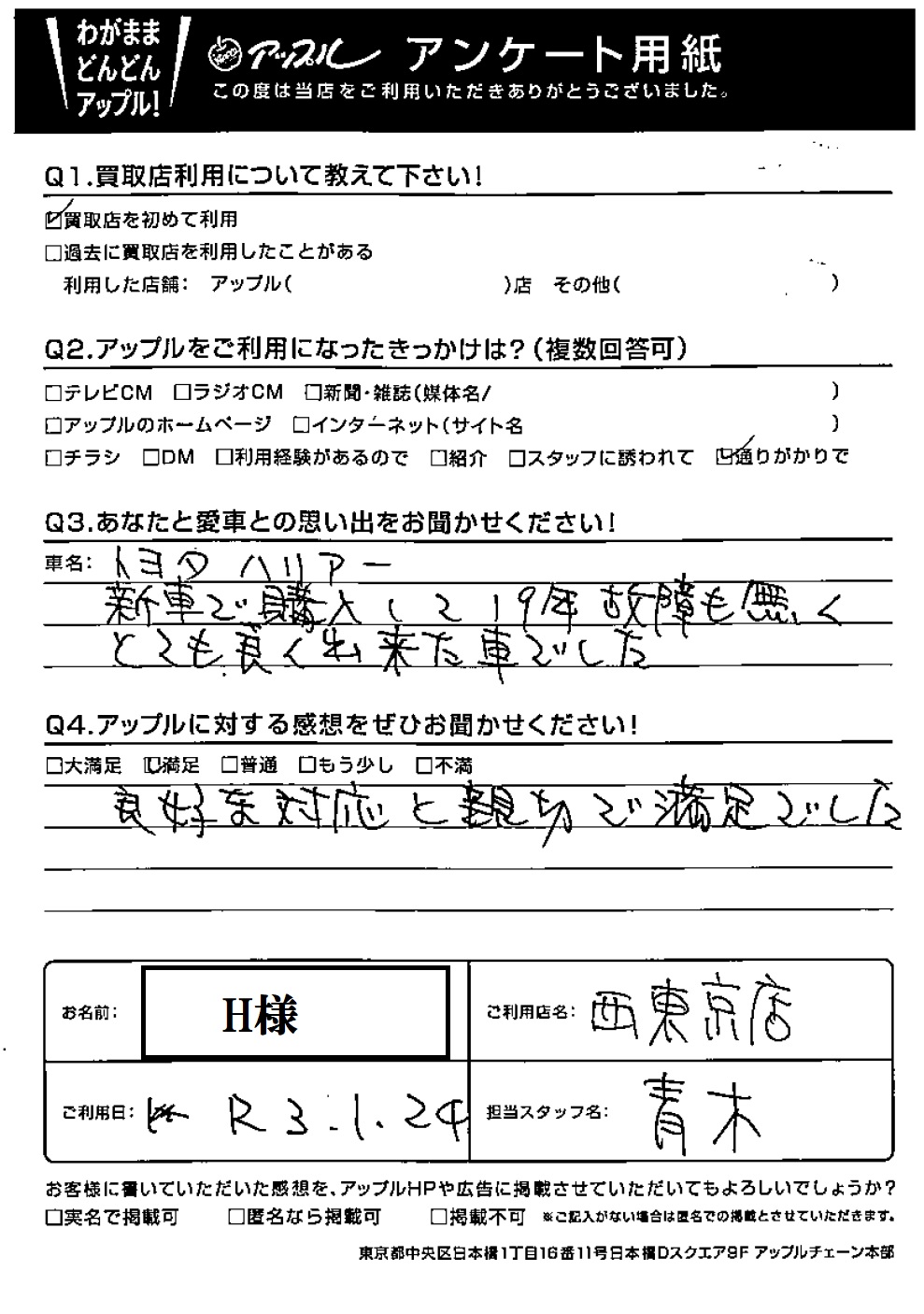 H様 車名:トヨタ ハリアー (H25年12月~のハイブリッド含む)