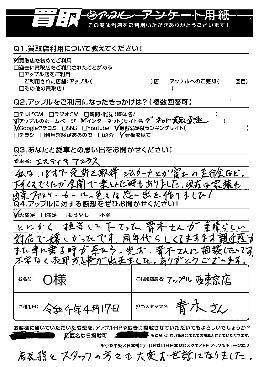 O様 車名:トヨタ エスティマ