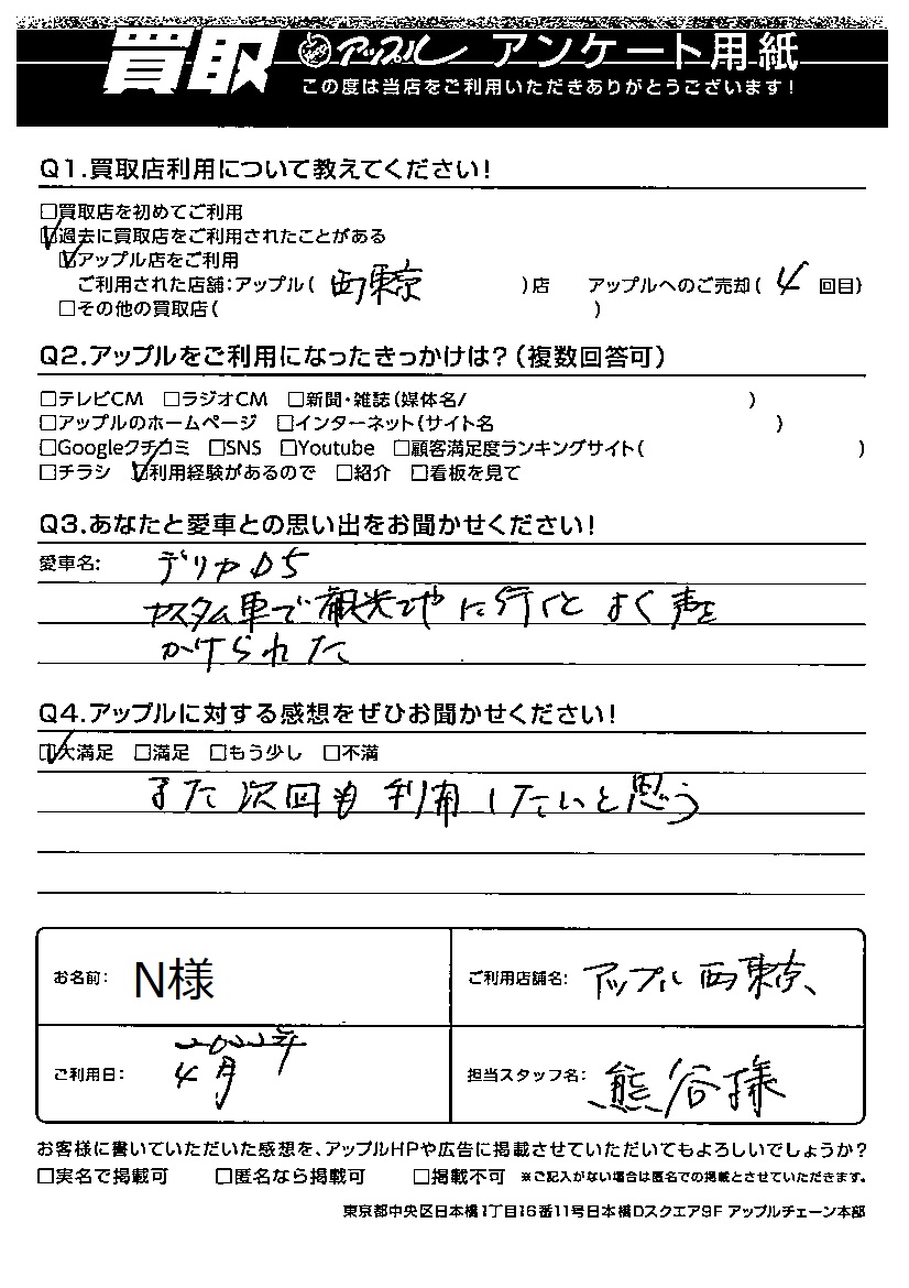 お車のご相談・ 査定だけでもOK! カンタン 入力 30秒 アップルがブランド買取始めました! お電話でも受付中! 受付時間10:00 ~ 19:00 0120-28-1688 お車のご相談・ 査定だけでもOK! カンタン 入力 30秒 アップルがブランド買取始めました! お電話でも受付中! 受付時間10:00 ~ 19:00 0120-28-1688 アップルがブランド買取始めました! お電話でも受付中! 受付時間10:00 ~ 19:00 0120-28-1688 店舗情報 在庫車 スタッフ紹介 ブログ お客様の声 キャンペーン 無料査定 click お客様の声 ご記入日: 2022/04/01 N様 車名:三菱 デリカD:5 Q あなたと愛車との思い出をお聞かせください!カスタム車で観光地に行くとよく声をかけられた。Q アップルに対する感想をぜひお聞かせください!感想:大満足また次回も利用したいと思う。 前へ 次へ お客様の声一覧を見る